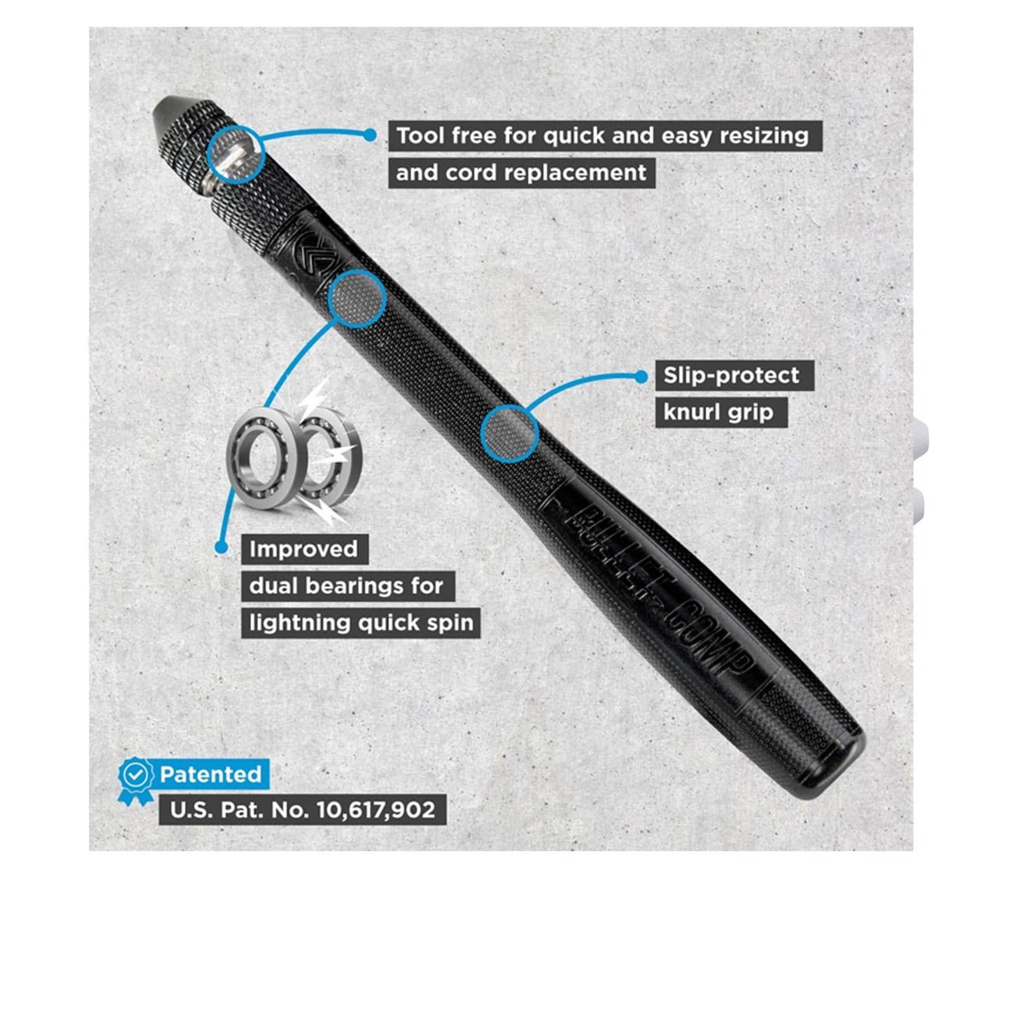 Få omedelbar förbättring av din hastighet och double unders med Bullet COMP®, ett premium hastighetshopprep med en ultrasmidig och snabb spinn. Huvudet snurrar nästintill friktionsfritt och ger dig möjligheten att hoppa betydligt snabbare än tidigare. Detta är hopprepet som ses som "Världens snabbaste hopprep". Atleten Nick Mathews vann Event 3 vid 2022 CrossFit Games med Bullet COMP®