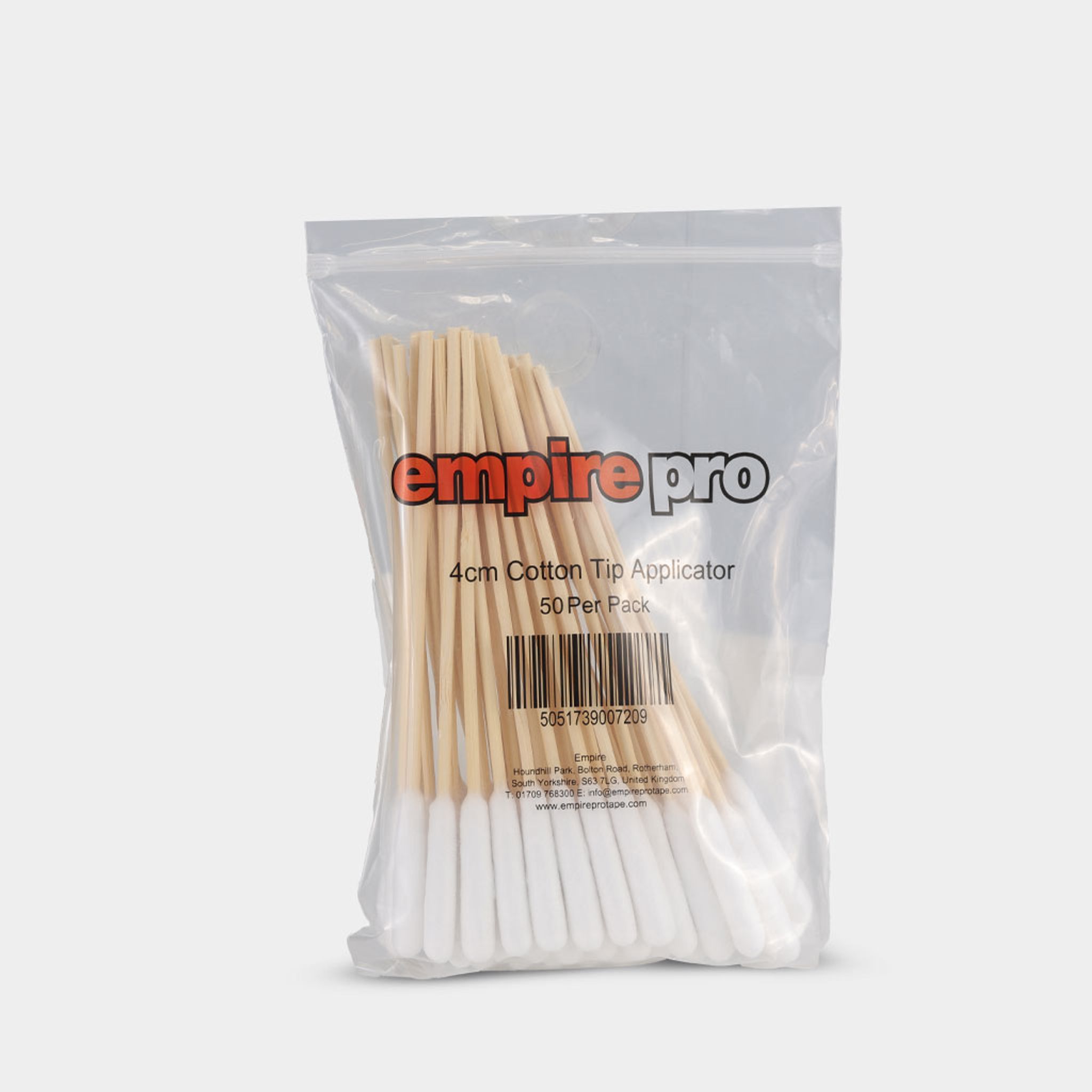 Empire Pro bomullstops är tillverkade för att erbjuda den perfekta storleken på en bomullspinne för att fungera på de mest krävande cutten. Den unika sammansatta ullen erbjuder perfekt bibehållning av vätska och säkerställer att ingen kontaminering strömmar in i ögonen och att svabbområdet är effektivt på de djupaste skären. Den 4 cm långa bomullspinnen levereras på flexibla bambuskaft för att erbjuda perfekt tryckapplicering.